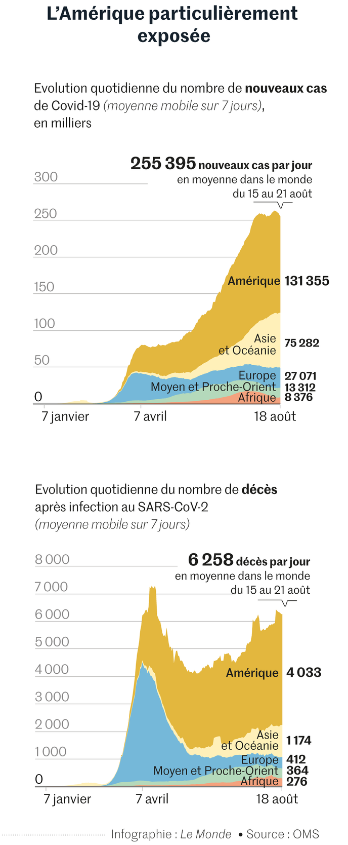 Quand on regarde la courbe épidémique mondiale, on voit que le nombre de nouveaux cas, qui était reparti à la hausse en juin, observe un plateau élevé mais constant depuis la fin juillet, autour de 300 000 par jour. La courbe des décès, elle, a suivi une progression très rapide entre mars et avril, puis un léger tassement à partir de début mai. Il y a eu une reprise presque plus modérée, le nombre total de décès rapportés dans le monde n’a pas été aussi haut en juillet et août qu’il ne l’avait été en mars-avril, on n’est pas très loin des 7 000 décès par jour.
