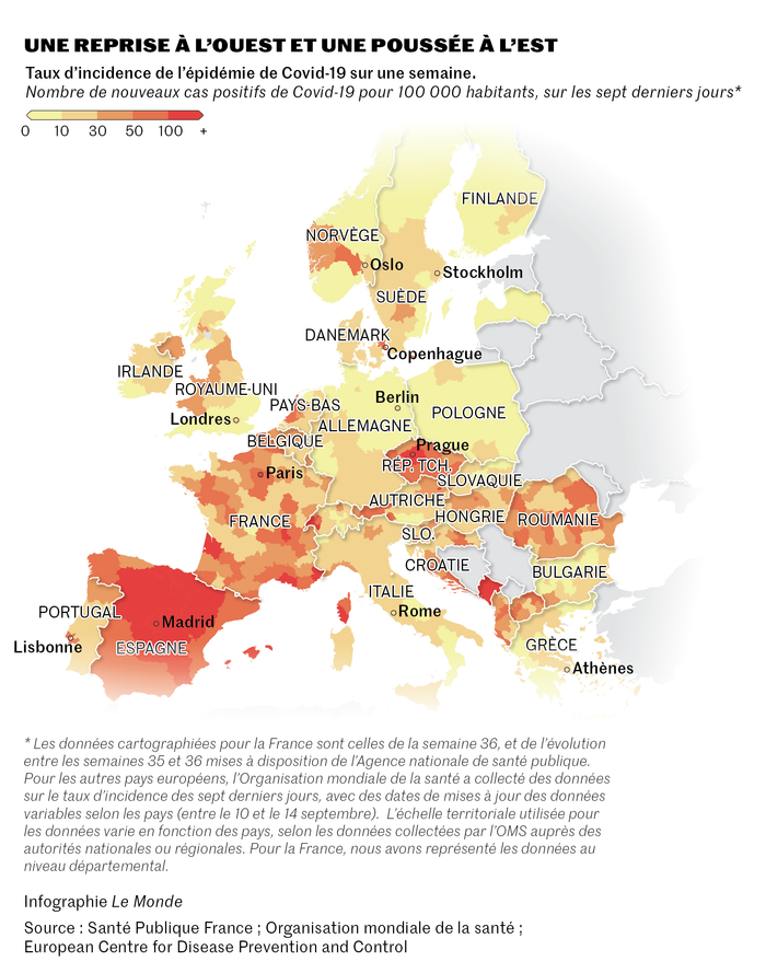 Un peu partout en Europe, on se prépare à faire face à une « seconde vague » de l’épidémie de Covid-19. L’expression est encore sujette à polémique entre spécialistes, mais force est de constater une hausse généralisée des cas quotidiens de personnes testées positives. Plus de 51 000 nouveaux cas ont été enregistrés pour la seule journée de vendredi dans les 55 pays de la branche européenne de l’Organisation mondiale de la santé, qui se réunit lundi 14 et mardi 15 septembre pour son comité régional annuel.Lire aussi Le point sur la pandémie de Covid-19 : l’OMS s’attend à une remontée du nombre de morts en Europe cet automne