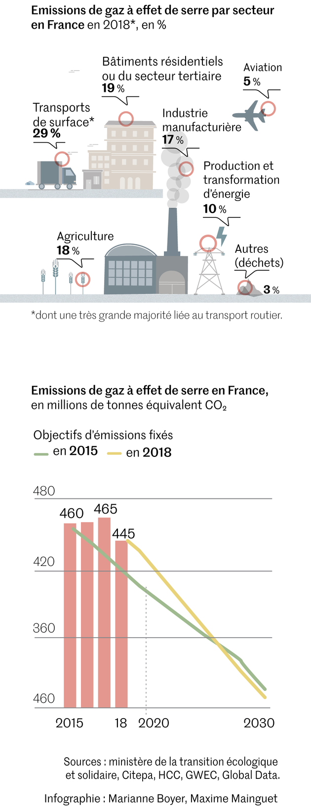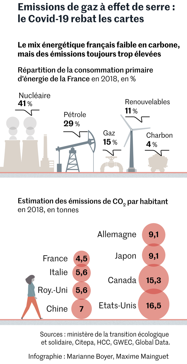 Certes, les mesures de confinement ont fait temporairement baisser les émissions de gaz à effet de serre. Mais cela donne aussi la mesure du chemin à parcourir : les rejets carbonés devraient diminuer entre 5 % et 15 % sur l’année 2020 en France, selon le Haut Conseil pour le climat. Une baisse massive, mais inférieure à ce qui est nécessaire pour espérer atteindre un jour les objectifs de l’accord de Paris.