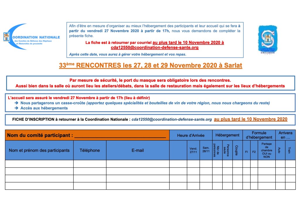 La fiche est à retourner par courriel au plus tard le 10 Novembre 2020 à cda12550@coordination-defense-sante.org Après cette date, vous aurez à gérer votre hébergement et vos repas.