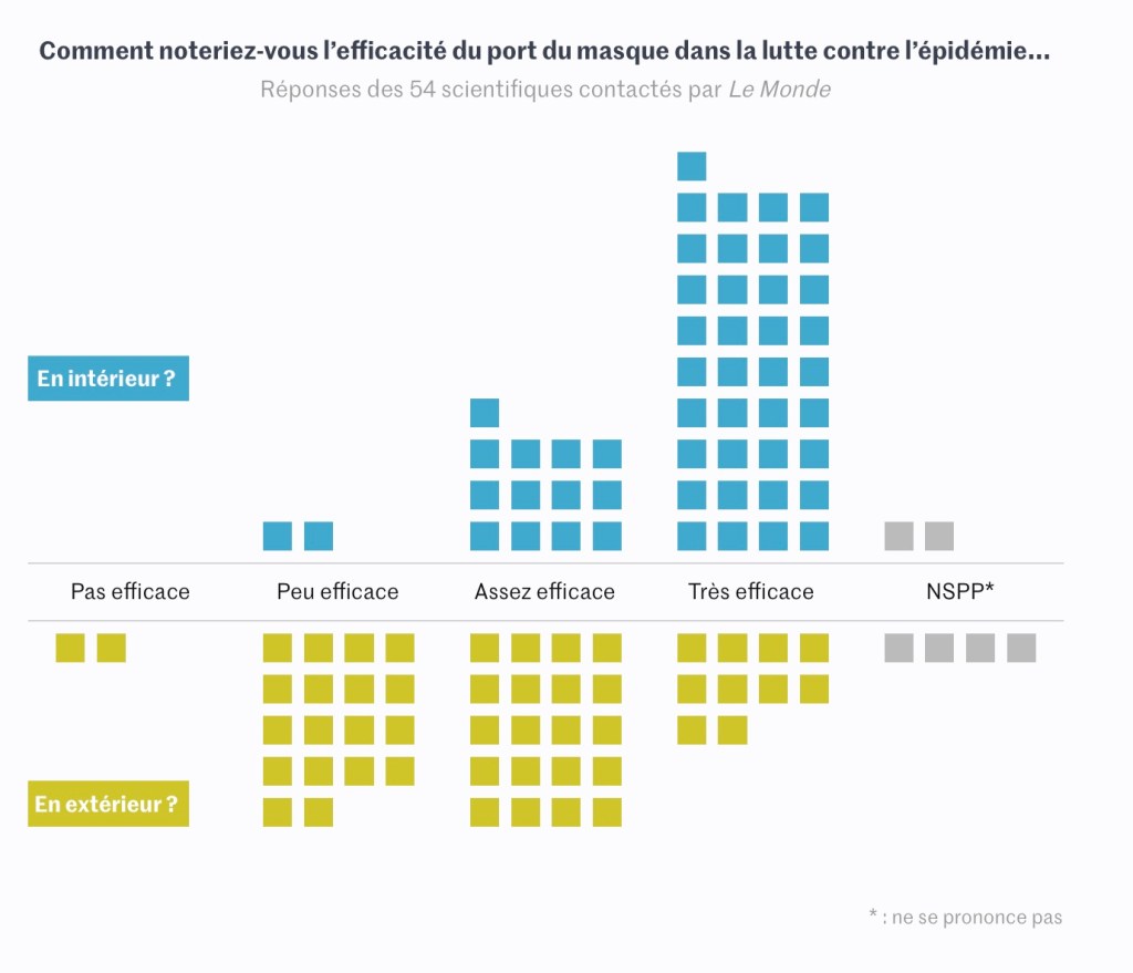 « Mais dès que l’on aborde l’utilité du masque en extérieur, le consensus se brise. La faute, en premier lieu, à une littérature académique plus chiche sur le sujet, regrettent à l’unanimité les scientifiques sondés. En dehors des configurations où la foule est groupée (marchés, centres-villes, manifestations), ils sont nombreux à penser que son utilité reste à démontrer », indique le quotidien.