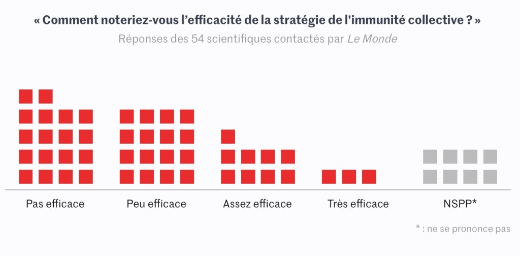 Le Monde évoque en outre un « consensus autour du principe de précaution », ou encore « la stratégie d’immunité collective en question » : « Les scientifiques sont très sceptiques sur la stratégie de l’immunité collective naturelle, qui consiste à ne pas ou peu lutter contre l’épidémie dans la population, de sorte qu’une grande partie de celle-ci (60%-70%) développe une immunité contre le virus, et freine durablement sa circulation. Si certains chercheurs estiment que «l’immunité collective sera probablement le facteur principal qui permettra de contrôler cette épidémie», cette analyse reste minoritaire parmi celles et ceux que nous avons interrogés ».