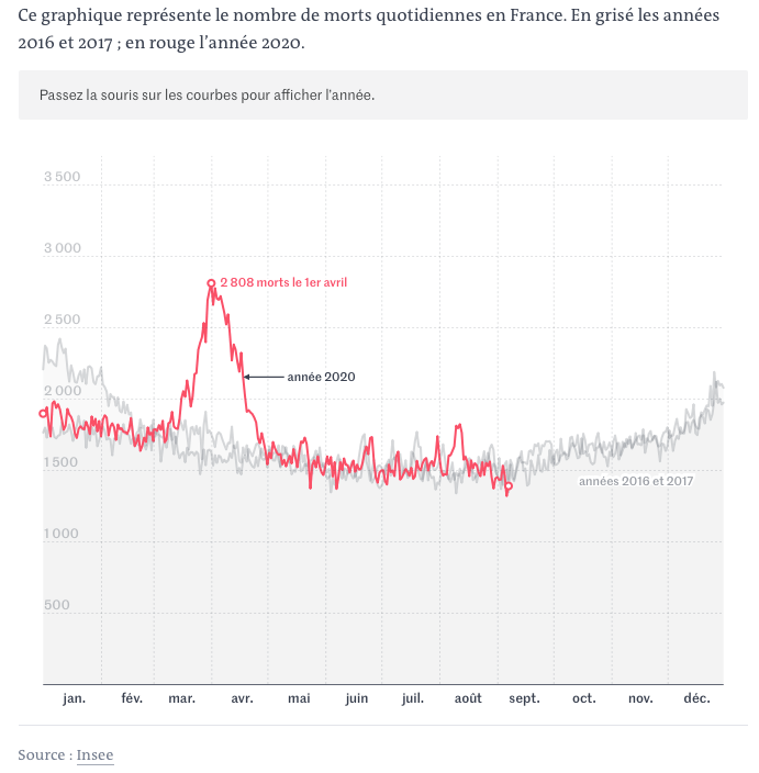 Ce graphique représente le nombre de morts quotidiennes en France. En grisé les années 2016 et 2017 ; en rouge l’année 2020.