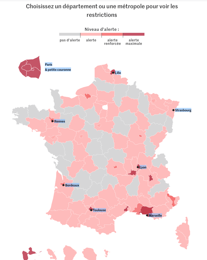 Cet article a été mis à jour le 12 octobre, en fonction des annonces des autorités à cette date. Les contours de certaines mesures peuvent évoluer, et toutes les spécificités locales ne sont pas détaillées.Choisissez un département ou une métropole pour voir les restrictionsNiveau d’alerte :pas d’alertealertealerte renforcéealerte maximaleParis& petite couronneGuadeloupeMartiniqueGuyaneLa RéunionMayotteLyonMarseilleToulouseRennesBordeauxLilleStrasbourgLe niveau d’alerte est déterminé par le ministère de la santé d’après le taux d’incidence dans la population générale et chez les plus de 65 ans, et la part des patients Covid-19 en réanimation.Lire aussi Vos questions sur le couvre-feu et l’état d’urgence sanitaire : Faut-il une attestation pour sortir ? Est-il interdit de voir des amis ou sa famille ?