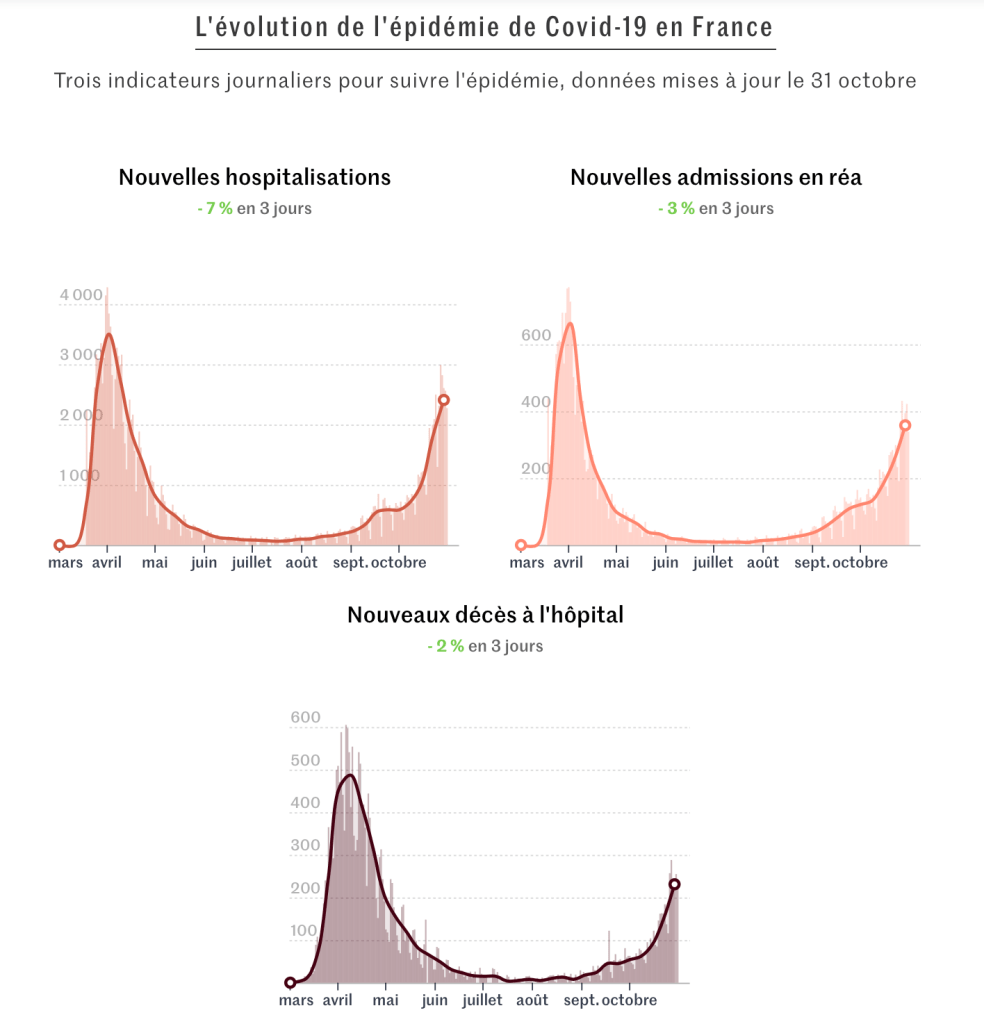 Depuis septembre, les services concernés se remplissent à vue d’œil malgré les progrès faits dans la prise en charge de la maladie au cours des derniers mois. Près de 3 400 patients étaient hospitalisés en réanimation au 30 octobre, un nombre qui est encore loin du pic d’avril (environ 7 000 patients au pire de la crise), mais qui pose déjà des problèmes dans de nombreux services concernés.L’évolution de l’épidémie de Covid-19 en FranceTrois indicateurs journaliers pour suivre l’épidémie, données mises à jour le 31 octobre