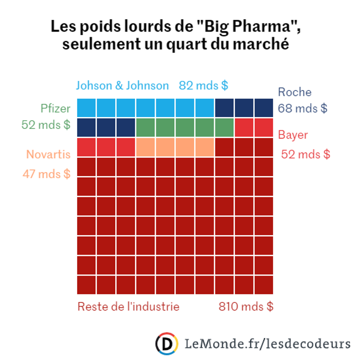 Les cinq premiers groupes à l’échelle mondiale (Johnson & Johnson, Roche, Pfizer, Bayer et Novartis) représentent environ un quart du marché, et seule une vingtaine d’entreprises du secteur dépasse les 10 milliards de chiffre d’affaires.