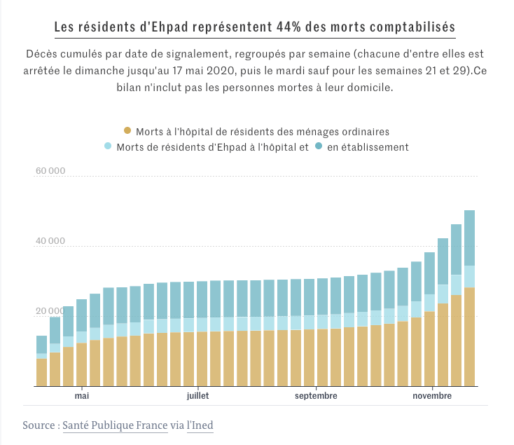 Selon le décompte diffusé par l’Institut national d’études démographiques (INED), la proportion des résidents d’Ehpad parmi les morts du Covid-19 a baissé : de mars à fin juillet, ils représentent 48 % des décès recensés, alors qu’ils ne sont plus que 34 % du total des morts survenues de début août à fin novembre. Il s’agit néanmoins d’une évolution à interpréter avec précaution, compte tenu de la fragilité des données.