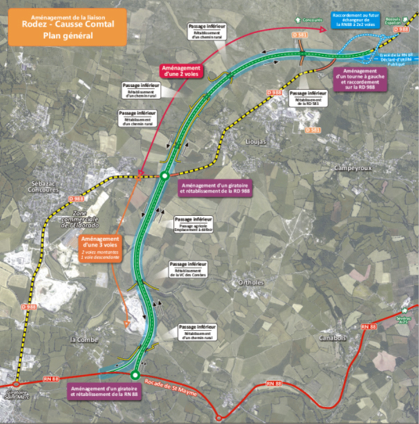 Seule une première tranche entre Rodez et le Causse-Comtal est actuellement est en cours de travaux et financée par le Conseil Départemental (Voir fiche : Aménagement de la RN88 – Rodez – Causse Comtal)