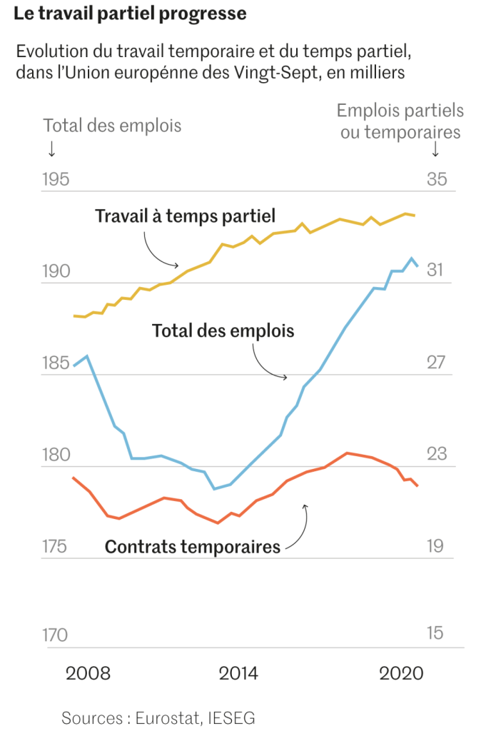 C’est notamment le cas en Espagne, où les précaires, pour l’essentiel des jeunes, des femmes et des personnes peu qualifiées sont la variable d’ajustement, premiers licenciés durant les récessions. Résultat, selon la Banque d’Espagne, le salaire des moins de 35 ans était, en 2018, toujours inférieur à son niveau de 2007. En outre, l’accès aux dispositifs de formation professionnelle est limité, alors que le système éducatif a, déjà, des ratés