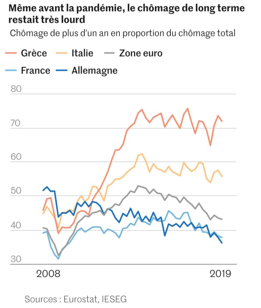 Dans le sud de l’Europe, les politiques d’austérité menées dans la foulée de la dernière crise – coupes dans les dépenses sociales, flexibilisation de l’emploi – ont laissé de lourdes séquelles. Voire, ont aggravé des problèmes préexistants, à l’exemple de la forte dualité du marché du travail, opposant des salariés en CDI très protégés, à des contrats temporaires très flexibles. D’après Eurostat, 22,2 % des 15-29 ans ne sont ni étudiants, ni dans un emploi, ni en formation en Italie, 17,7 % en Grèce et 14,9 % en Espagne, contre 12,5 % en moyenne dans l’UE, et 7,6 % en Allemagne. Ces pays ont en commun de manquer de politiques actives permettant aux chômeurs et aux salariés de mettre leurs compétences à jour, loin du modèle de la « flexisécurité » danoise.