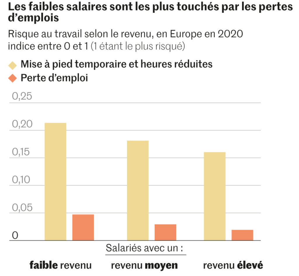 En Europe, le choc social de la pandémie a été inévitablement brutal, malgré les politiques d’aide publique extrêmement actives. Les pays qui étaient déjà les plus fragiles sont aussi les plus touchés. L’Espagne, très touristique, est celui qui a perdu le plus d’emplois au deuxième trimestre, suivi de l’Italie et du Portugal. L’Italie, la Grèce et l’Irlande sont ceux où le nombre d’heures travaillées a le plus baissé. En Grèce, le tourisme représente 20 % du PIB, et ce secteur (en incluant la restauration) a connu un bond de 20 % du chômage.