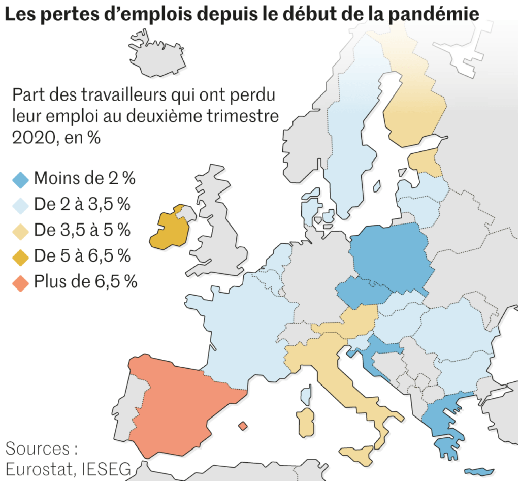 A travers le continent, le fameux modèle social européen a-t-il pu néanmoins absorber le choc ? Le chômage partiel mis en place a pour l’instant permis d’éviter une envolée des licenciements. Le taux de chômage moyen de l’UE n’a augmenté que d’un point sur un an, à 7,6 % en octobre (en zone euro, un point de hausse aussi, à 8,4 %). En Espagne, la hausse est plus notable, passant de 14 % à 16,2 % sur la même période.