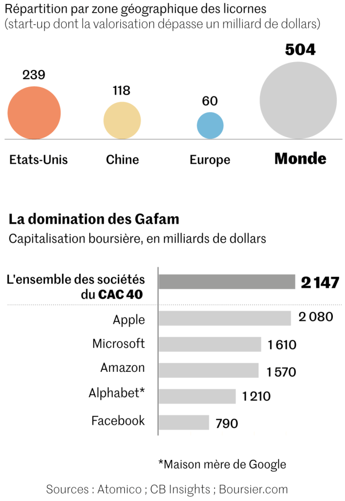 La marche est haute. Un peu plus de 10 % des licornes – ces start-up valorisées à plus de 1 milliard de dollars (826 millions d’euros) – de la planète sont européennes, selon le recensement effectué par le cabinet CB Insights. Autre chiffre symbolique : avec une capitalisation boursière de 2 100 milliards de dollars, Apple pèse à lui seul aussi lourd que l’ensemble des entreprises du CAC 40.