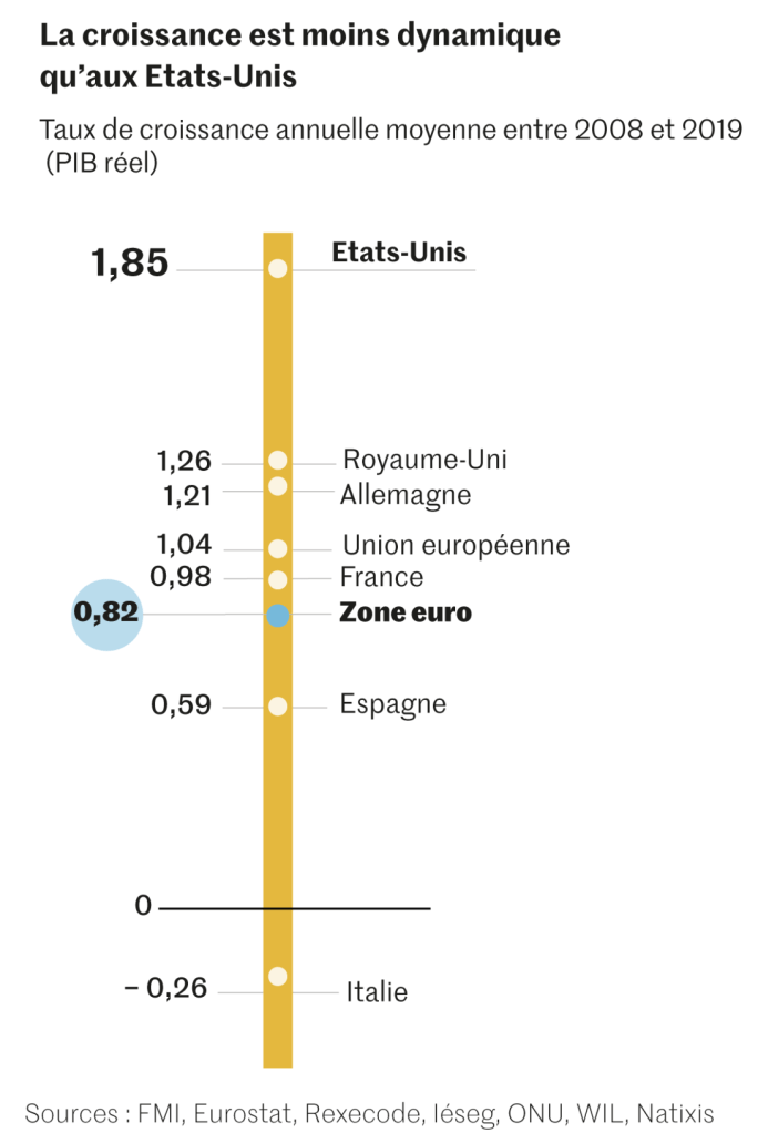 Les économistes sont presque unanimes sur le constat. « Sur le diagnostic, il n’y a pas photo », regrette Gilles Moëc, économiste en chef à Axa. « De 2008 à 2019, la croissance américaine a été de 1,85 % par an, celle de la zone euro de 0,82 %, environ deux fois moins », précise Eric Dor, directeur de la recherche économique à l’école de commerce Iéseg.