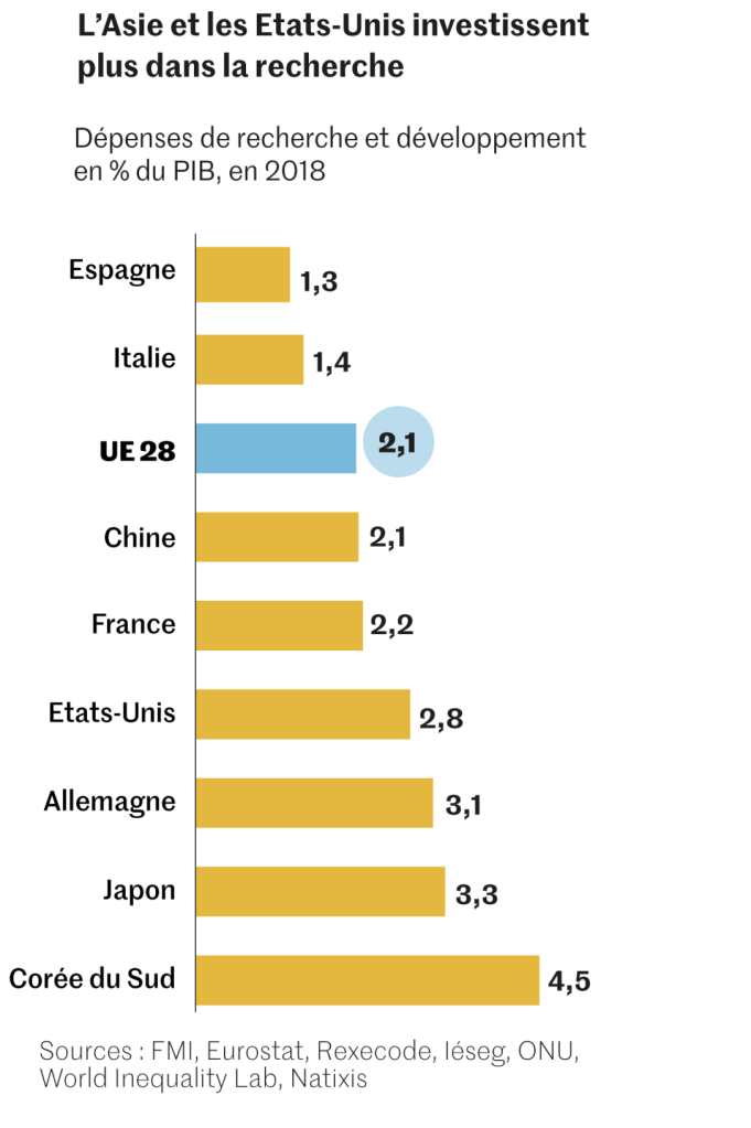 Ce retard est en partie une question d’argent. Les dépenses en R&D s’élèvent ainsi à 2,1 % du PIB de l’UE, contre 2,8 % aux Etats-Unis, et plus de 4 % en Corée du Sud, selon Eurostat. Les Américains disposent, en outre, de vastes marchés financiers favorables au financement des start-up, sans équivalent européen. Et surtout, d’un écosystème plus favorable à l’innovation : lien fort entre les grandes universités telles que le Massachusetts Institute of Technology (MIT) et l’industrie, soutien de l’armée à la recherche publique, culture de l’entrepreneuriat plus audacieuse. De son côté, l’Etat chinois subventionne massivement les secteurs qu’il juge stratégiques.Article réservé à nos abonnés Lire aussi Christine Lagarde : « Les nouvelles restrictions pèsent sur la reprise »
