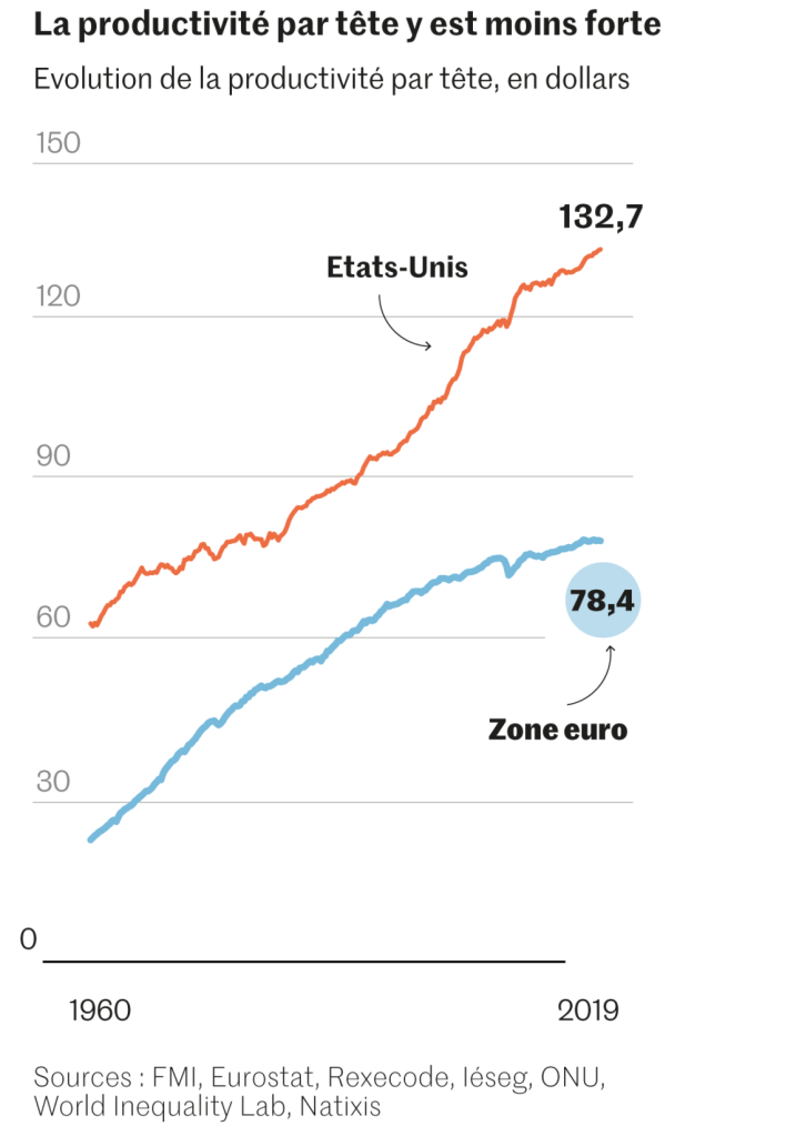 Les ratés de la politique économique européenne n’expliquent cependant pas tout. « Même sans prendre en compte la crise liée au Covid, la croissance potentielle tourne autour de 2 % aux Etats-Unis, contre 1 % en moyenne en Europe », détaille Patrick Artus, économiste en chef de Natixis. Pour faire simple, celle-ci dépend de trois grands facteurs : la quantité de personnes qui travaillent (plus la population active grandit, plus la croissance progresse), la quantité d’investissements et la productivité. « Sur ces trois facteurs, l’Europe n’est pas bien placée », souligne M. Moëc.