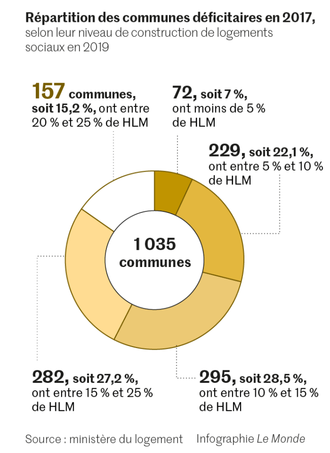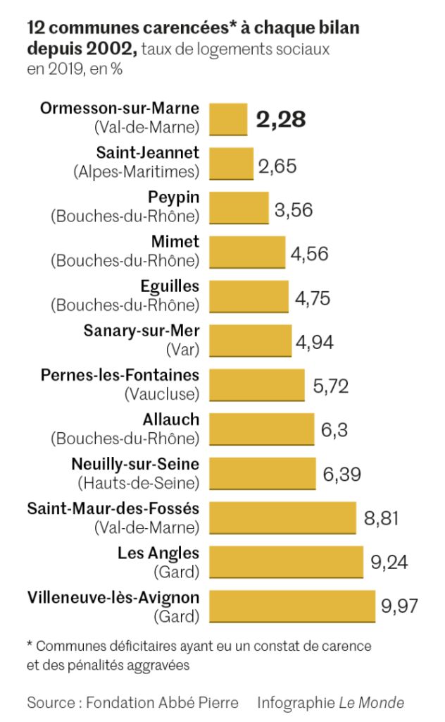 Quelques maires se refusent toujours à construire « social » malgré les sanctions financières, que certains se vantent de préférer payer, voire en font un argument électoral. Le maire de Mimet (Bouches-du-Rhône), dont le parc HLM plafonne à 4,15 %, a même fondé une Association des villes carencées, qui compte une centaine de membres sur les 269 communes dans ce cas, comptabilisées en 2017. Selon la Fondation Abbé-Pierre et son palmarès triennal des « communes récalcitrantes », publié le 8 décembre, douze communes, dont trois en Ile-de-France et neuf en région Provence-Alpes-Côte d’Azur et dans le Gard mitoyen, battent un record de mauvaise volonté en étant six fois de suite, tous les trois ans depuis 2002, « en constat de carence », c’est-à-dire sanctionnées pour de bon.