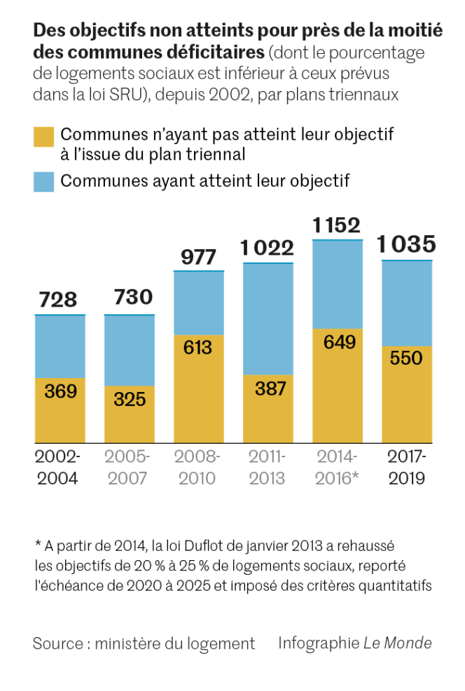 Avec 870 000 logements HLM construits entre 2000 et 2019 dans des communes qui en manquaient, soit la moitié de la production totale, le bilan de la loi solidarité et renouvellement urbains (SRU) est flatteur. Une poignée d’élus y restent encore idéologiquement réfractaires ou ont du mal, à cause de la configuration de leur territoire, à atteindre leur quota : 301 communes comptent, fin 2019, moins de 10 % de HLM, loin des 20 % à atteindre cette année et plus encore des 25 % en 2025. Les mécanismes incitatif et coercitif de la loi s’interrompront-ils en 2025, avec l’extinction de la loi ?