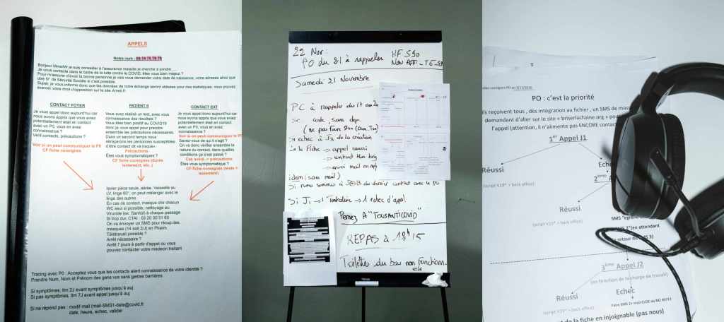 Ici, à Villeneuve-d’Asq, nous ne sommes pas dans un centre d’appels comme ceux des produits commerciaux. « On n’est pas là pour vendre des doubles vitrages », résume Adam Delory. Chaque conseiller a devant lui un calendrier en carton, pour calculer les dates de période d’isolement et de contagiosité en fonction des contaminations, des premiers symptômes, du résultat des tests. Il dispose aussi d’un épais script de sujets à aborder, qui évolue au gré des consignes venues d’en haut. Dernière en date : « Faire la promotion de l’application TousAntiCovid ».