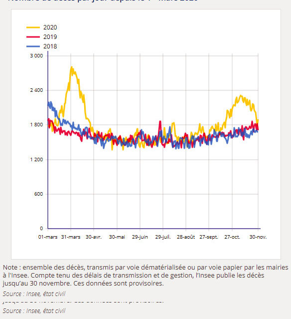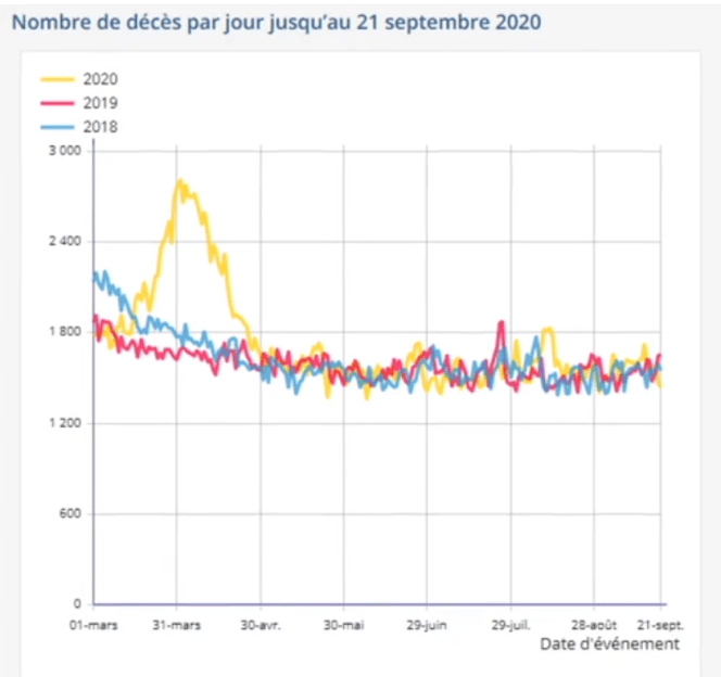 « Ces courbes appartiennent à l’Insee. Elles correspondent au nombre de morts total en 2018, 2019 et 2020 de mars à septembre. Le virus a donc particulièrement sévi du 15 mars au 15 avril, période où nous étions tous confinés grâce à une mesure historique censée ne pas faire apparaître cette courbe. »