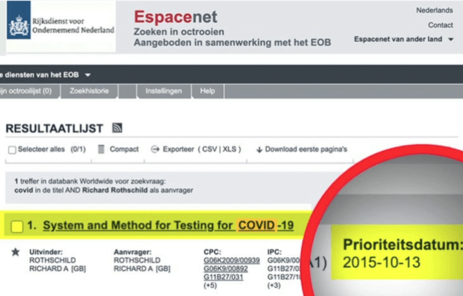 Autre thèse avancée par le documentaire : un cercle d’initiés aurait eu connaissance de l’existence du coronavirus SARS-CoV-2 bien avant 2019. Jean-Bernard Fourtillan, un ancien professeur de chimie thérapeutique (par ailleurs mis en cause dans une affaire d’essais cliniques douteux), assure qu’il a récemment « découvert que l’on avait pris un brevet sur les tests pour détecter la maladie Covid-19 le 13 octobre 2015. Donc ils connaissaient le virus… » Le supposé brevet apparaît alors à l’image, comme une preuve de son affirmation.