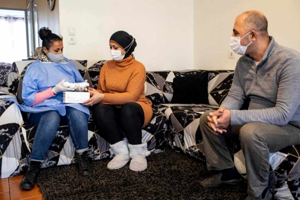 Chez les Djouad, la maladie est arrivée deux semaines auparavant par Ahlem, la maman, 39 ans. La jeune femme a été testée positive dans les locaux de l’association, un ancien garage à deux pas de là. « Nous sommes intervenus tout de suite à domicile pour tester toute la famille, expliquer les gestes à suivre pendant l’isolement, faire des courses et fournir des masques et du gel hydroalcoolique », reprend Yasmine Cherfi. Sept jours plus tard, c’est le père, Djamel, professeur de mathématiques dans un institut d’insertion, puis l’aîné des enfants, 13 ans, qui réagissent aux tests PCR. « Les trois autres enfants étaient négatifs, nous avons continué à les accompagner à l’école », reprend Yasmine.