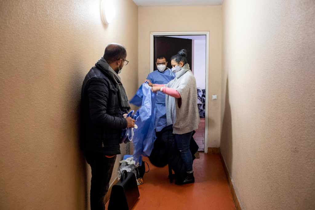 Devant la porte de l’appartement, Karim Seffraoui, infirmier de 36 ans qui intervient bénévolement en marge de sa propre activité, est déjà là. Charlotte blanche sur la tête, blouse bleue, gants et masque, il aide l’équipe à s’habiller sur le seuil. « On n’arrive pas équipés en cosmonaute pour ne pas déclencher de psychose chez les voisins », explicite-t-il mi-amusé, mi-sérieux.