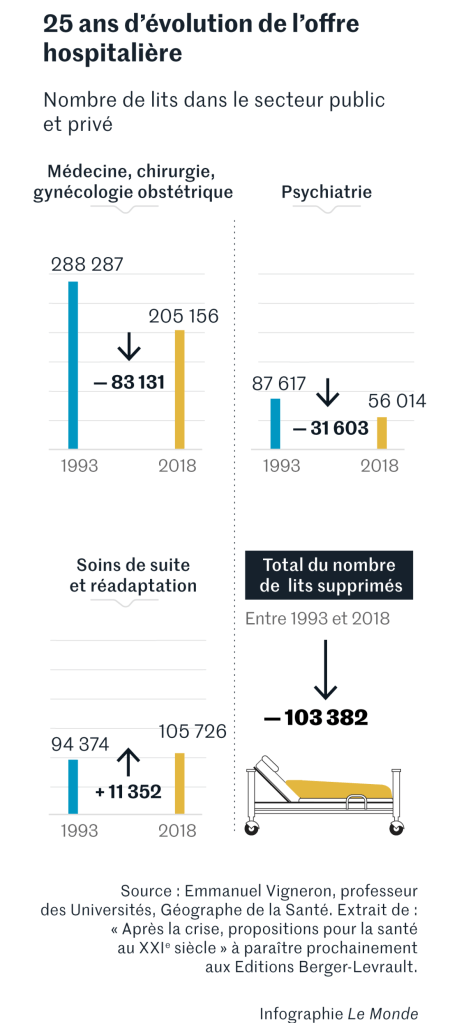 Depuis plus de trente ans, le mouvement a été massif dans les hôpitaux français. Entre 1993 et 2018, près de 100 000 lits ont été fermés, dont 83 000 en médecine, chirurgie et obstétrique, soit, pour cette seule catégorie, une baisse de 29 % en vingt-cinq ans, selon les calculs du géographe de la santé Emmanuel Vigneron.