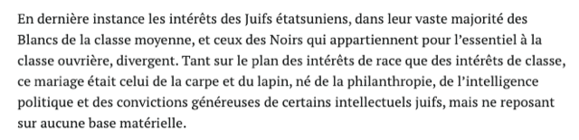 En dernière instance les intérêts des Juifs étatsuniens, dans leur vaste majorité des Blancs de la classe moyenne, et ceux des Noirs qui appartiennent pour l’essentiel à la classe ouvrière, divergent. Tant sur le plan des intérêts de race que des intérêts de classe, ce mariage était celui de la carpe et du lapin, né de la philanthropie, de l’intelligence politique et des convictions généreuses de certains intellectuels juifs, mais ne reposant sur aucune base matérielle.
