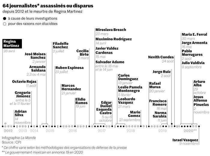 Avec huit tués en 2020, le Mexique est le pays le plus meurtrier au monde pour les professionnels des médias. Deux d’entre eux ont été assassinés, cette année, dans le Veracruz, qui possède le triste record des crimes dirigés contre les journalistes parmi les 32 Etats mexicains. « Ils sont tués afin de taire une information gênante pour le crime organisé ou pour les autorités corrompues, qui n’hésitent pas à recourir à l’ultraviolence », s’insurge Jan-Albert Hootsen, représentant du CPJ au Mexique, en précisant que plus de 90 % de ces meurtres restent impunis.