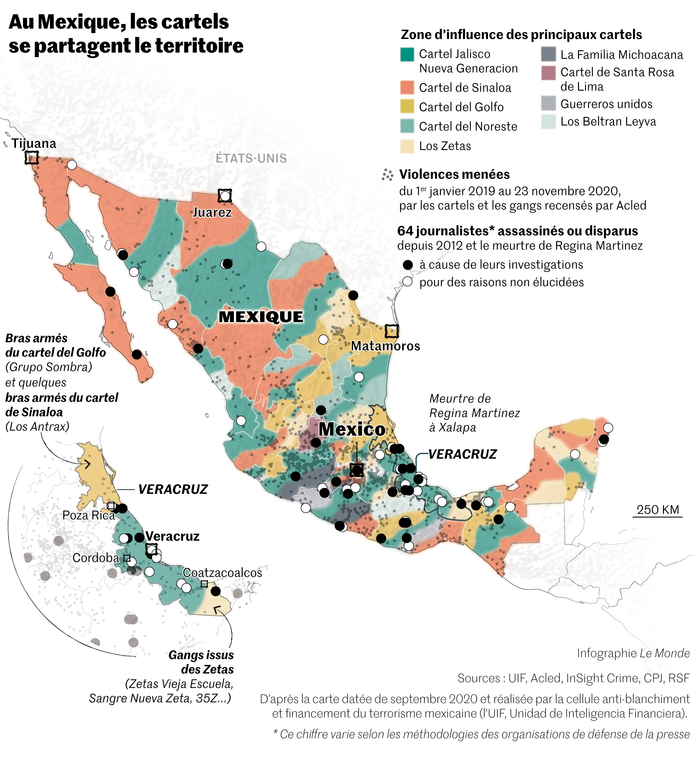 Pour Balbina Flores, représentante au Mexique de Reporters sans frontières (RSF), « le parti Morena est arrivé dans un système enraciné depuis des années. La corruption de responsables politiques locaux, et leur connivence avec le crime organisé, n’a pas changé ». Dans le Veracruz, le cartel de Los Zetas a perdu sa guerre contre le CJNG. Le premier s’est fragmenté. Le second est devenu l’un des plus puissants du Mexique, attisant une vague de violence sans précédent (environ 100 homicides par jour en 2020 dans tout le pays). Dans ce contexte, les agressions contre les professionnels des médias (224 en 2020) bondissent, selon les chiffres officiels. Quarante pour cent d’entre elles sont attribuées à des fonctionnaires. « Le plus dangereux est de révéler les liens entre la politique et le narcotrafic », souligne M. Carrasco, devenu depuis directeur de Proceso.