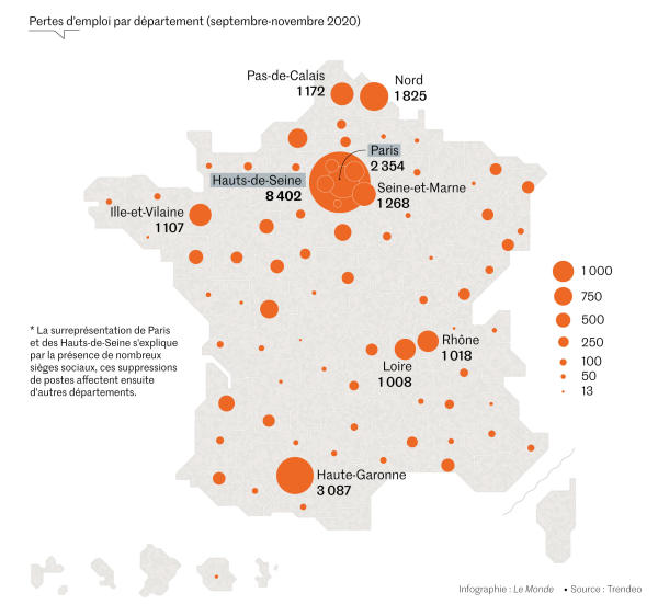 Malgré les aides massives de l’Etat, plus de 35 000 destructions de postes ont été annoncées depuis septembre dans l’Hexagone, selon les données compilées par Trendeo pour « Le Monde ». Les experts s’alarment d’une explosion des faillites en 2021.