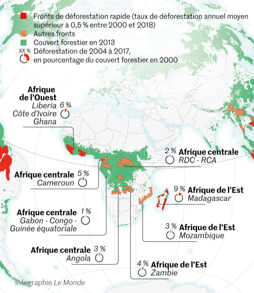 Les fronts de la déforestation se multiplient et s’étendent, alerte le Fonds mondial pour la nature, le WWF. La Terre, qui était couverte à 50 % de forêts il y a huit mille ans, ne l’est plus qu’à 30 %. Non seulement de nouvelles zones soumises aux incendies et aux défrichements apparaissent en Afrique – au Liberia, au Ghana, à Madagascar – et en Amérique latine – notamment au Mexique et au Guatemala –, mais la destruction des jungles, forêts primaires ou sèches, savanes arborées s’accélère partout sur la planète.