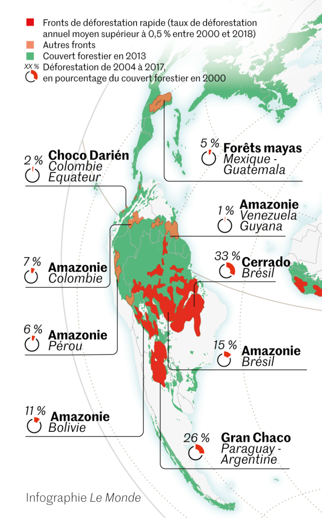 Ces régions ont perdu, entre 2004 et 2017, au moins 43 millions d’hectares, soit plus de 10 % de leurs couverts forestiers. Près de la moitié (45 %) des superficies arborées restantes sont dorénavant fragmentées par des routes ou d’autres infrastructures, ce qui les fragilise et les rend plus vulnérables aux feux et au changement climatique. L’Amérique latine, Madagascar, Sumatra et Bornéo pour l’Asie du Sud-Est figurent parmi les zones les plus affectées.