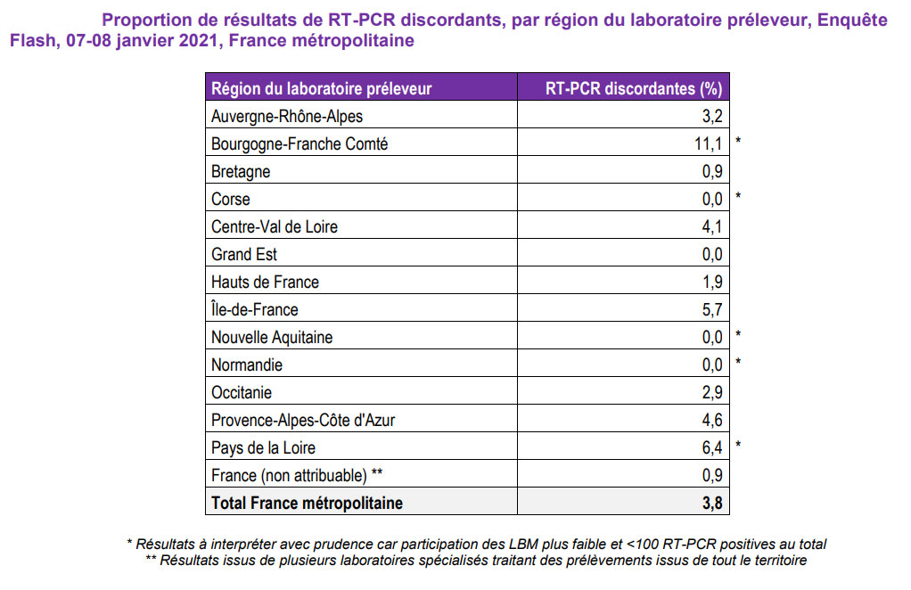 La proportion de résultats de RT-PCR discordants, rapportée au total des RT-PCR positives, est de 3,8 %. « Par ailleurs les données actuelles du CNR, dans le cadre de la surveillance des variants sur le territoire français, ont montré que 38 % des résultats discordants étaient ensuite confirmés par séquençage. Sur la base de ces données, il est ainsi possible d’estimer que le variant VOC 202012/01 serait responsable de 1 à 2% des cas de COVID-19 actuellement diagnostiqués en France » estime SPF.