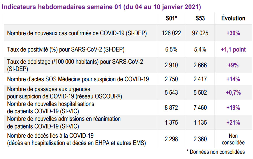 – En semaine 1 (du 04 au 10 janvier 2021), les indicateurs épidémiologiques de la Covid-19 virent tous au rouge selon les dernières données de Santé Publique France (tableau 1).