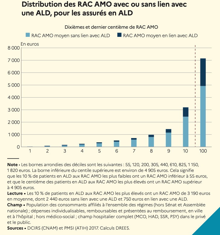 Malgré le dispositif ALD, pour près de 1 % de ses bénéficiaires, les RAC AMO sont encore supérieurs à 4 900 euros annuels et composés en moyenne à 70 % de dépenses sans lien avec leur(s) affection(s).