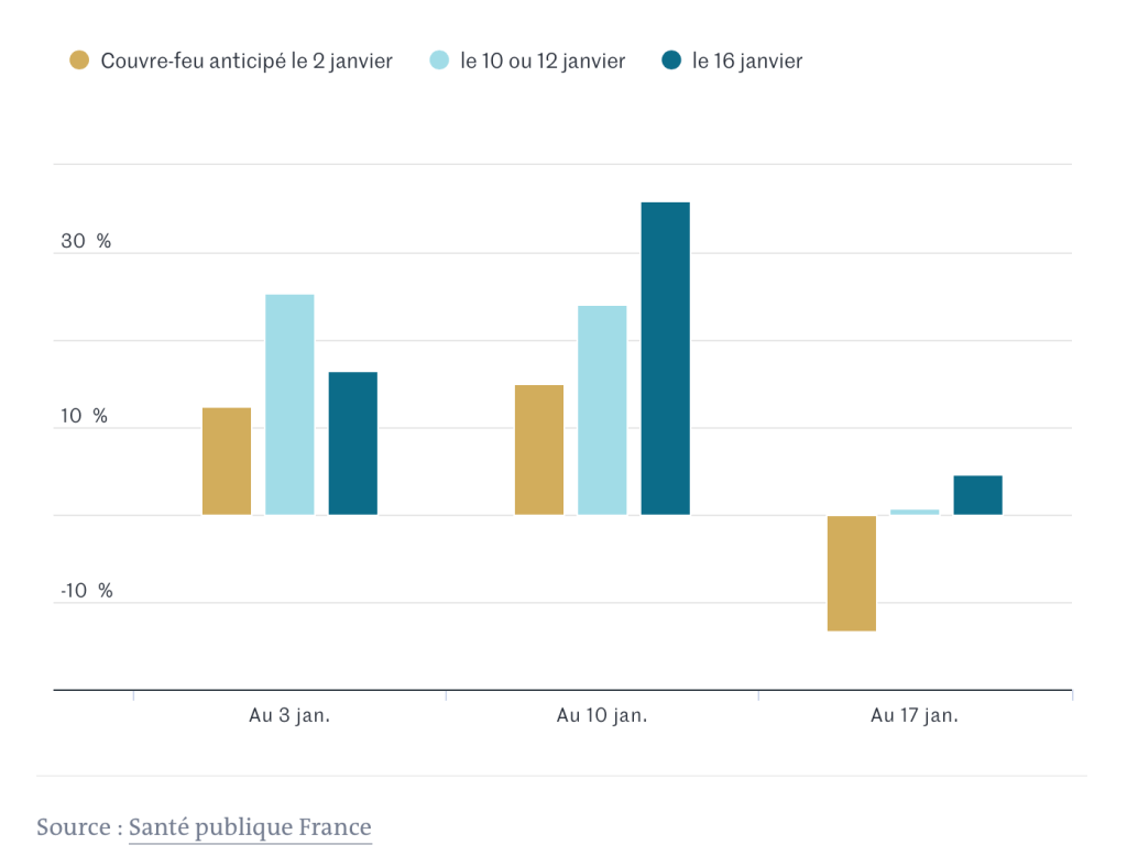 Dans son point épidémiologique hebdomadaire, publié vendredi, Santé publique France (SPF) a divisé les départements en trois groupes en fonction de leur date d’application du couvre-feu à 18 heures : le 2 janvier pour les quinze premiers, le 10 ou 12 janvier pour les dix suivants, le 16 janvier pour l’ensemble de la France métropolitaine. Le taux d’incidence sur sept jours glissants est effectivement en baisse dans le premier groupe (− 13,3 % entre le 10 et le 17 janvier).