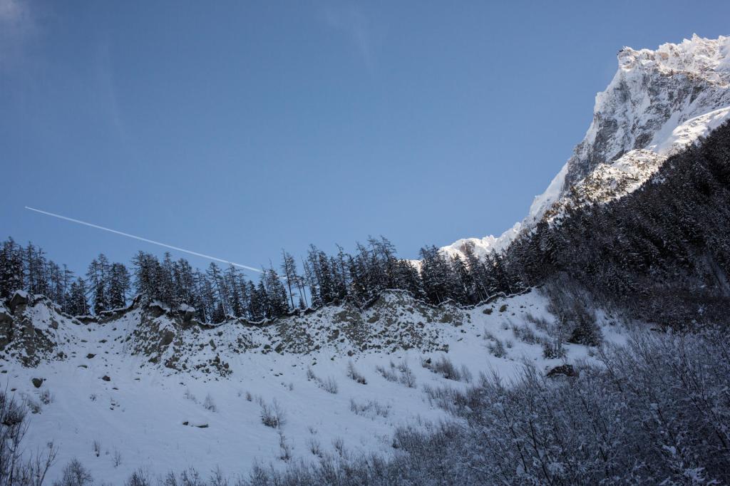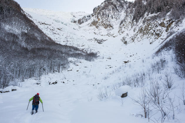 Soudain, la trace qui grimpait dans la poudreuse, à travers les épicéas, débouche sur un vaste replat. Les teintes bleutées de la neige se fondent dans le ciel. Silence et beauté absolus. Là, dans cette cuvette cerclée d’immenses moraines, venait s’échouer le glacier des Bossons il y a une trentaine d’années. Désormais, il faut lever les yeux pour apercevoir, 1 000 mètres plus loin, ce qu’il reste de la langue glaciaire connue pour être la voie historique d’ascension du mont Blanc.