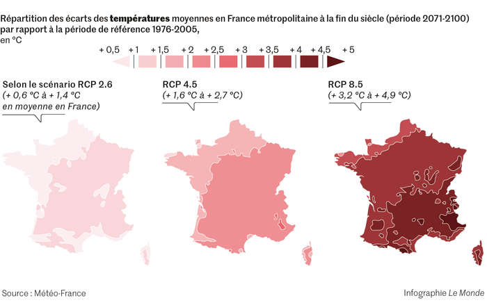 Ainsi, le réchauffement d’ici à la fin du siècle varie fortement selon le scénario d’émissions : en cas de rejets de CO2 non contrôlés, la température augmenterait de l’ordre de 3,9 °C par rapport à la période de référence 1976-2005 – à laquelle il faut encore ajouter 0,8 °C pour connaître le réchauffement depuis l’ère préindustrielle. Le thermomètre pourrait même afficher + 6 °C l’été, selon certaines simulations.