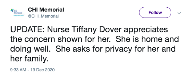 « L’infirmière Tiffany Dover est touchée par l’inquiétude manifestée à son encontre. Elle est chez elle à la maison, et va bien. Elle demande à ce que l’on respecte son intimité, et celle de sa famille. »