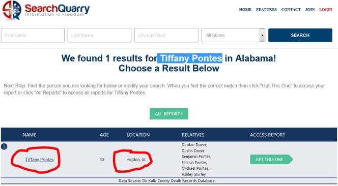 Si Tiffany Dover était morte, il devrait bien exister une trace dans les registres d’état civil américains. Partant de ce postulat, des internautes parcourent des sites consacrés à la recherche de certificats officiels ou consultent des bases de données généalogiques en ligne. Son nom apparaît sur SearchQuarry, un site qui héberge des documents publics facilement accessibles : voici enfin la preuve officielle que les adeptes de cette théorie attendaient.