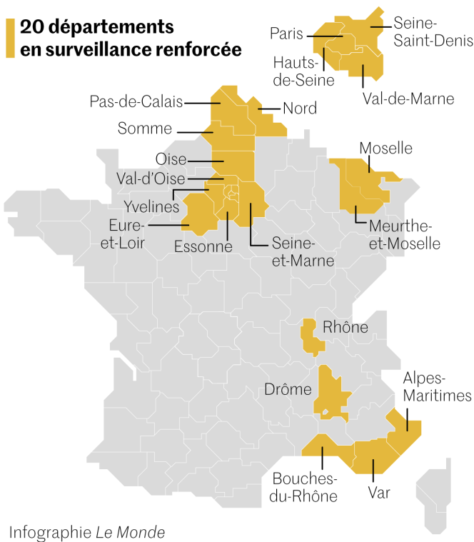 Vingt départements vont être surveillés comme le lait sur le feu par le gouvernement dans les prochains jours. Le premier ministre Jean Castex a annoncé, jeudi 25 février, que l’Ile-de-France, la majeure partie des Hauts-de-France et de Provence-Alpes-Côte d’Azur (PACA), mais aussi le Rhône, la Drôme, la Moselle, la Meurthe-et-Moselle et l’Eure-et-Loir étaient dans une situation préoccupante.