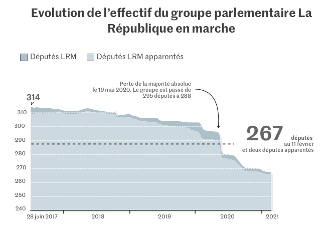 Ainsi s’ouvre la période de tous les doutes et des premiers bilans. Les députés se demandent s’ils souhaitent se représenter, si les promesses d’origine du macronisme ont été tenues, et mesurent aussi l’ampleur des départs de leur groupe : 44 depuis 2017. Ils étaient alors 313, en comptant les apparentés, bien au-dessus du seuil de la majorité absolue de 289. Au fil des démissions, les voilà 267, ce qui impose, à chaque vote, de compter désormais sur des partenaires, le MoDem et le groupe Agir, qui ont récupéré la moitié des démissionnaires. Le dernier départ en date est celui de la députée du Val-d’Oise Fiona Lazaar, qui citait en novembre l’épisode de l’article 24 comme élément déclencheur. « Quand vous avez des combats aussi éloignés des uns des autres, il y a un moment où on ne peut plus trouver un terrain d’entente… », résume-t-elle en relevant l’étroitesse du socle commun des « marcheurs ».