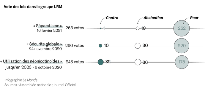 Selon les calculs du Monde effectués à partir des votes par voie électronique, issus des donnés de l’Assemblée nationale, les députés LRM ont voté en moyenne à 94,5 % en accord avec la ligne exprimée par le groupe. Il s’agit du deuxième plus haut taux de cohésion observé par rapport aux autres groupes politiques dans l’Assemblée durant ce mandat, derrière La France insoumise (99 %). Et cette loyauté dans les votes se renforce à l’approche des échéances électorales de 2021 et de 2022, chacun voulant préserver toutes ses chances d’une réinvestiture pour les prochaines législatives.