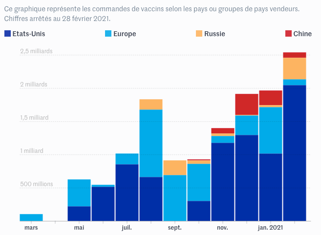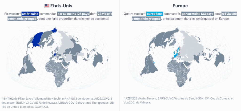 Si les cartes des commandes et précommandes de vaccin par groupe de pays ne permettent pas de représenter la quantité des livraisons, elles suggèrent toutefois une ambiance de « guerre froide » exacerbée par la pandémie. A un détail près, cependant : les Etats-Unis ont une stratégie légèrement différente de la Chine ou de la Russie, en faisant le choix de réserver leurs vaccins à leur population, avant d’en faire une arme d’influence extérieure, tandis que Moscou et Pékin cherchent déjà à exporter massivement.