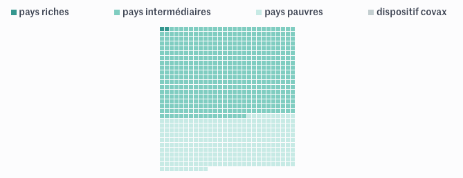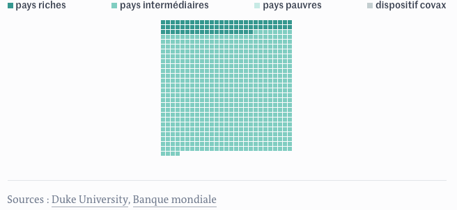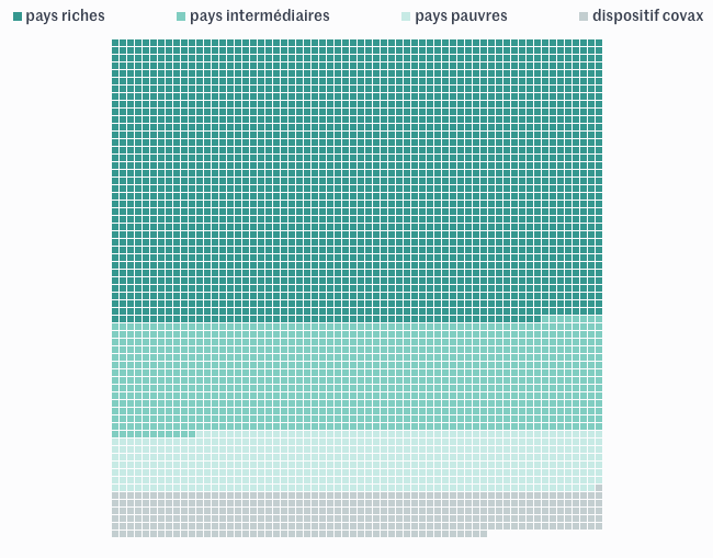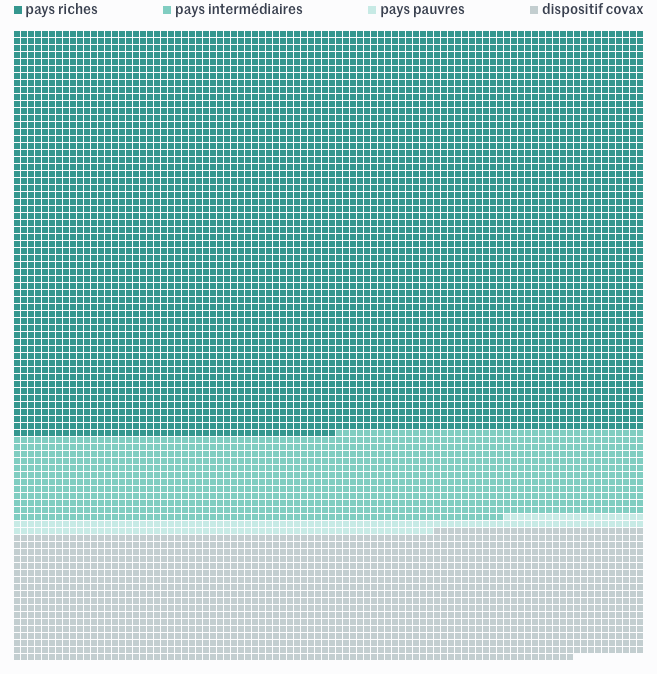 Ces graphiques représentent toutes les commandes et les précommandes par pays ou groupe de pays : chaque carré représente un million de doses, sélectionnez un carré pour afficher le détail.
