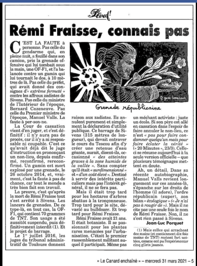 27 ans : l’âge qu’aurait eu aujourd’hui Rémi Fraisse, tué par un gendarme le 26 octobre 2014. Une vie qui aurait été épargnée si l’ensemble des mesures annoncées lundi avaient été prises dès le début du projet, si une véritable concertation avait eu lieu en amont, avec un véritable débat public ouvert sur l’ensemble des besoins de cette vallée tarnaise tenant compte des multiples avis défavorables et réserves de toutes les autorités environnementales.