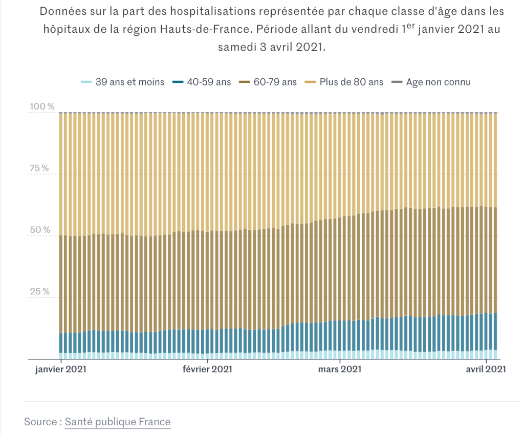 Pour Daniel Lévy-Bruhl, épidémiologiste à SpF, deux effets se combinent : « une diminution de la contribution des personnes les plus âgées (…), en grande partie le reflet de la campagne de vaccination », et « une tendance à la hausse du risque d’hospitalisation chez les adultes, en particulier les jeunes adultes ».