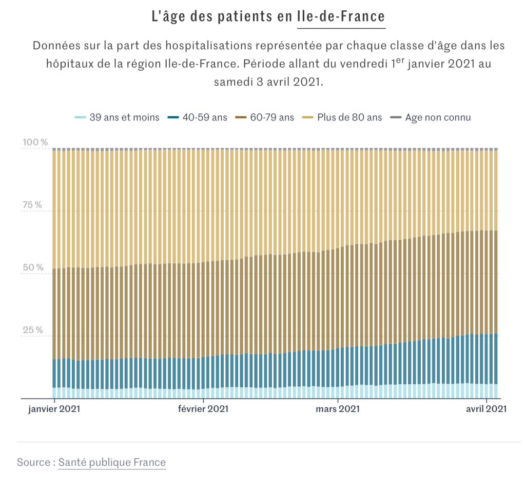 Sous l’effet de la campagne de vaccination, la part des plus de 70 ans en réanimation recule depuis le début de l’année. Celle des moins de 60 ans progresse en revanche, un effet potentiel du variant britannique.